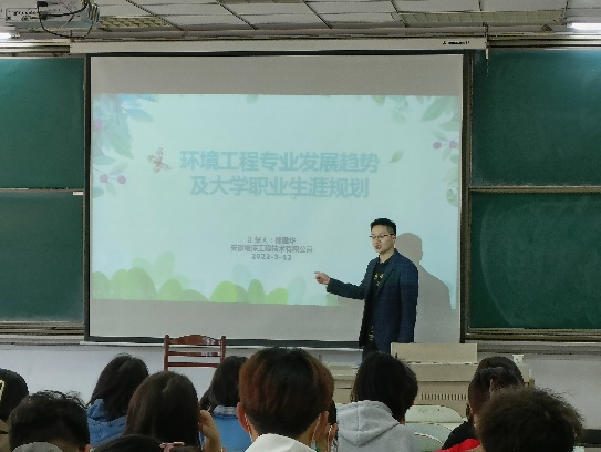 2016届环境工程本科毕业生和2018届环境工程专业硕士毕业生,2019年创办安徽维深工程技术有限公司。杨建华结合当前国家政策、污染现状、环保工程和环保技术案例,深入介绍了我国环境保护的现状和发展趋势,以及当前社会对环保类人才的能力要求;结合自己的求学和工作经历,对大一学生的学业生涯规划进行了指导。同时与大一学生就工作实习、专业发展前景等进行了互动交流。