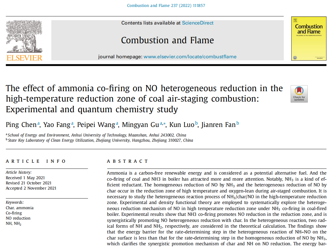 青年教师陈萍在燃烧领域国际权威期刊《Combustion and Flame》上,以第一作者身份发表了题为“The effect of ammonia co-firing on NO heterogeneous reduction in the high-temperature reduction zone of coal air-staging combustion: Experimental and quantum chemistry study”的论文。该论文通讯作者为69书吧
