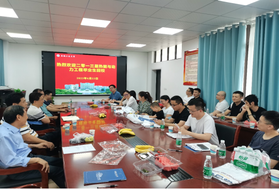 热能091班毕业十周年校友返校活动在学院325会议室举办,学院党委副书记、副院长谢文平、副院长楚化强、能动系主任徐俊超、教师代表李文科、李朝祥、段锋出席座谈会,2009级校友、能动系教师陈萍主持座谈会。