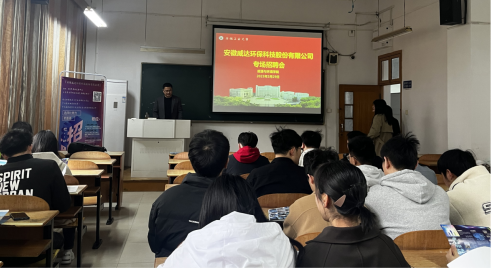 招聘会上,安徽威达环保科技有限公司人力资源部主任邢磊结合公司视频宣传片,向全体同学展示了公司的发展空间、培训方案、晋升渠道、福利待遇及岗位需求情况。邢磊还现场回答了部分同学提出的疑问,邀请有兴趣的同学前往公司生产基地与研发总部参观考察。招聘会现场收到近十份求职简历,还有几位同学通过网络向公司现场投递了求职简历。