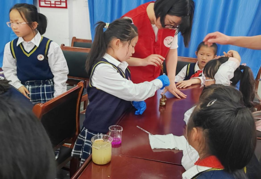 志愿者们在佳山社区服务中心提前布置现场。小学生们在志愿者们的指导协作下采用现场实验的方式开展两个关于污水与污水处理的实验。首先进行的是“毛细现象”净水实验。志愿者们介绍了本次实验的科学原理和实验步骤,随后同学们在志愿者的指导下进行实验。接下来进行的是酸碱中和滴定实验,参与实验的小朋友纷纷戴上保护手套。在过程中,同学们从实验变色的神奇现象中学习到了污水处理的重要意义,培养了他们勤于思考与勇于探索的精神。