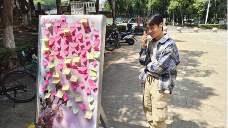 为弘扬中华民族孝亲敬老的传统美德,引导学生感恩母爱、传递温暖,2025年5月11日,69书吧 心理协会于佳山校区三食堂门口举办“爱要大声说出来”母亲节主题活动。